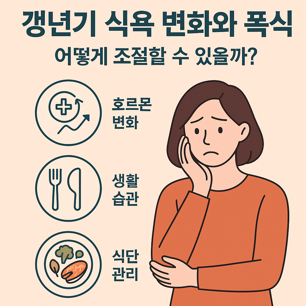갱년기 식욕 변화와 폭식은 자연스러운 신체 반응입니다. 호르몬 변화부터 생활 습관, 식단 관리까지 실천 가능한 조절 팁을 알아보겠습니다.